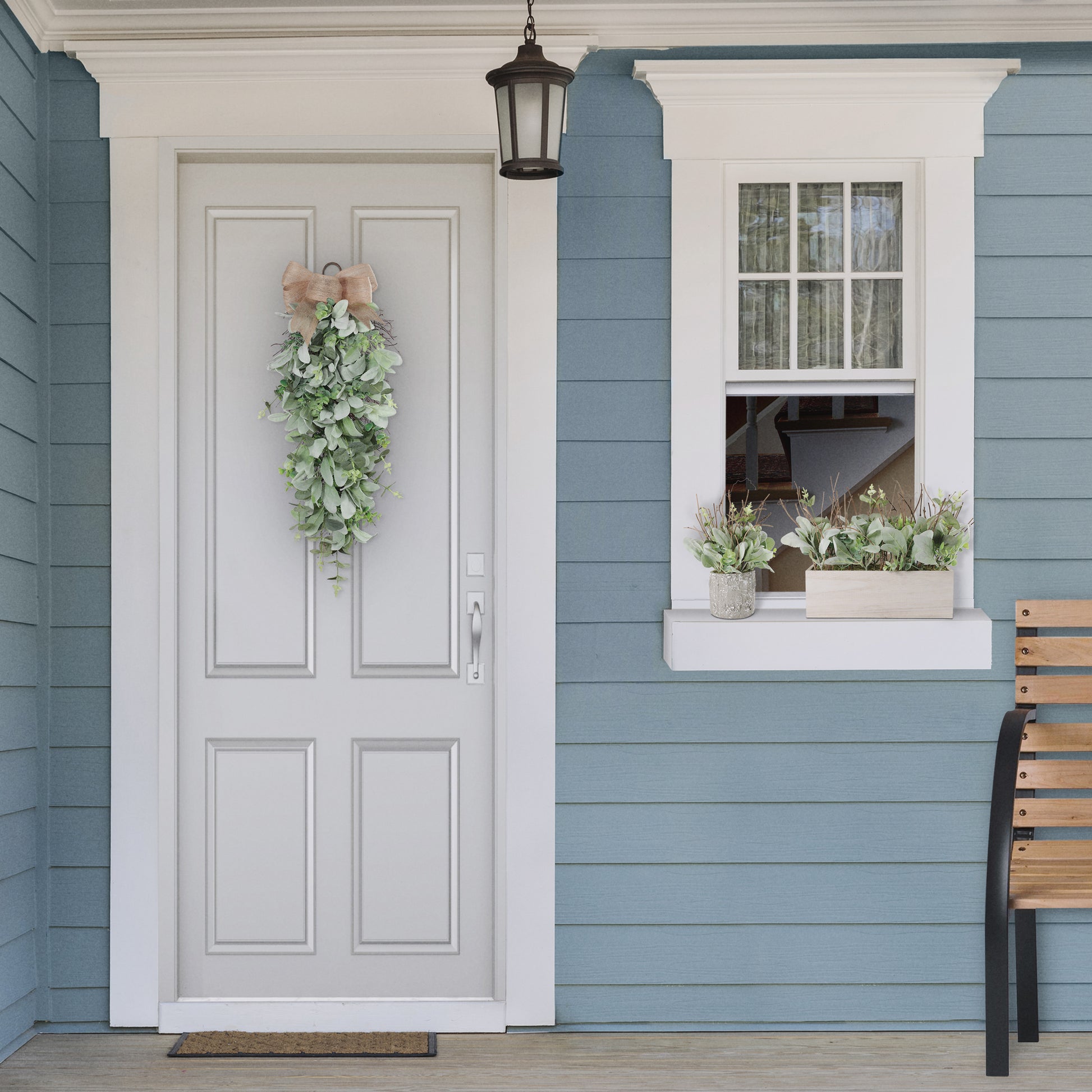 11" Lambs Ear Centerpiece with Twigs & Greenery Leaves in Wood Planter