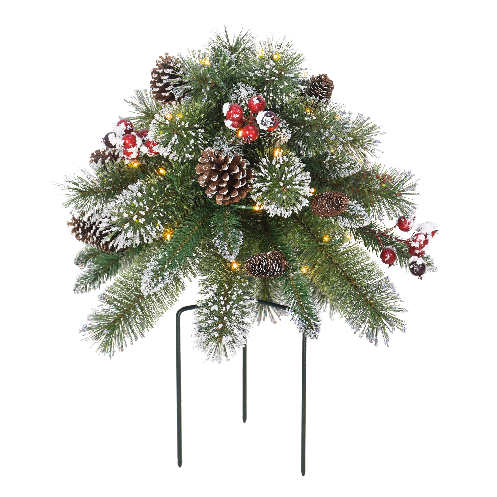18" Snowy Urn Filler, 48 Tips, 35 B/O Warm White LED Lights (3 x AA batteries not included), On/Off Timer Function, Pine Cones & Berries