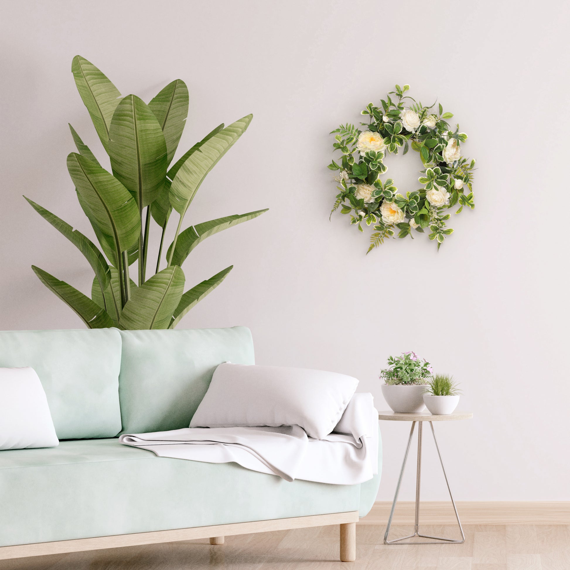 24" Artificial Camellia,Peony Floral Spring Wreath With Green Leaves