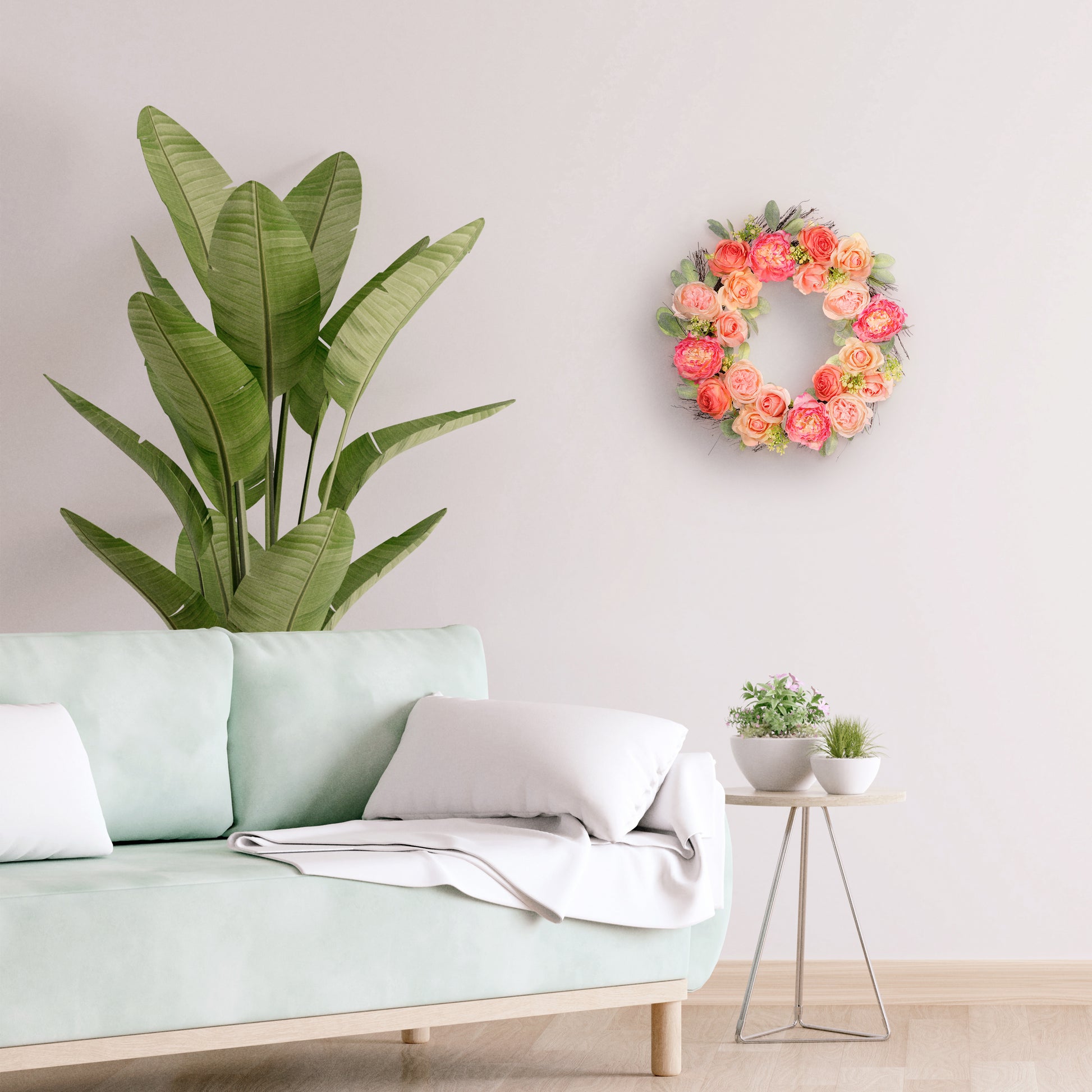 24" Artificial Peony,Rose Floral Spring Wreath With Green Leaves