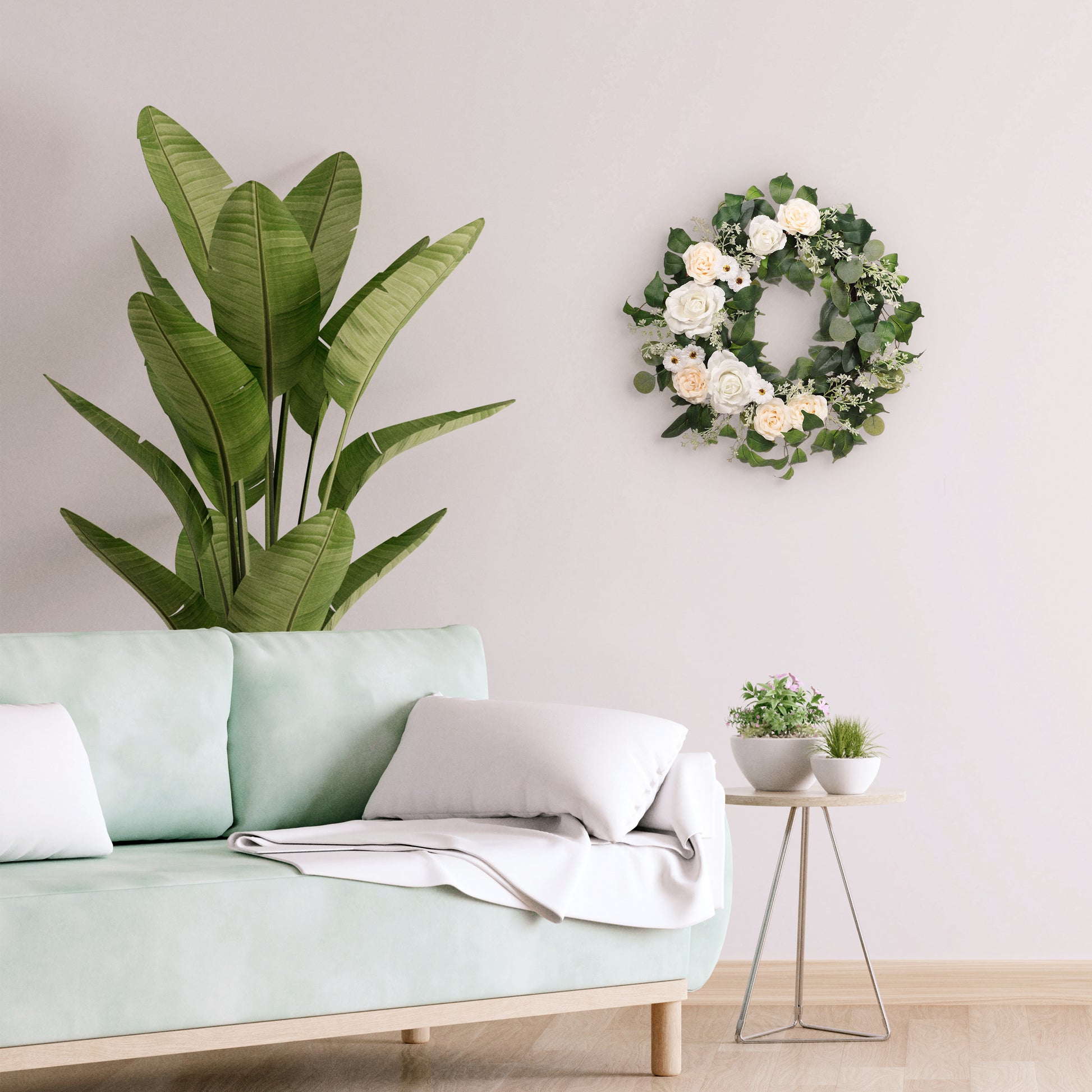 24" Artificial Rose,Camellia,babysbreath Floral Spring Wreath With Green Leaves