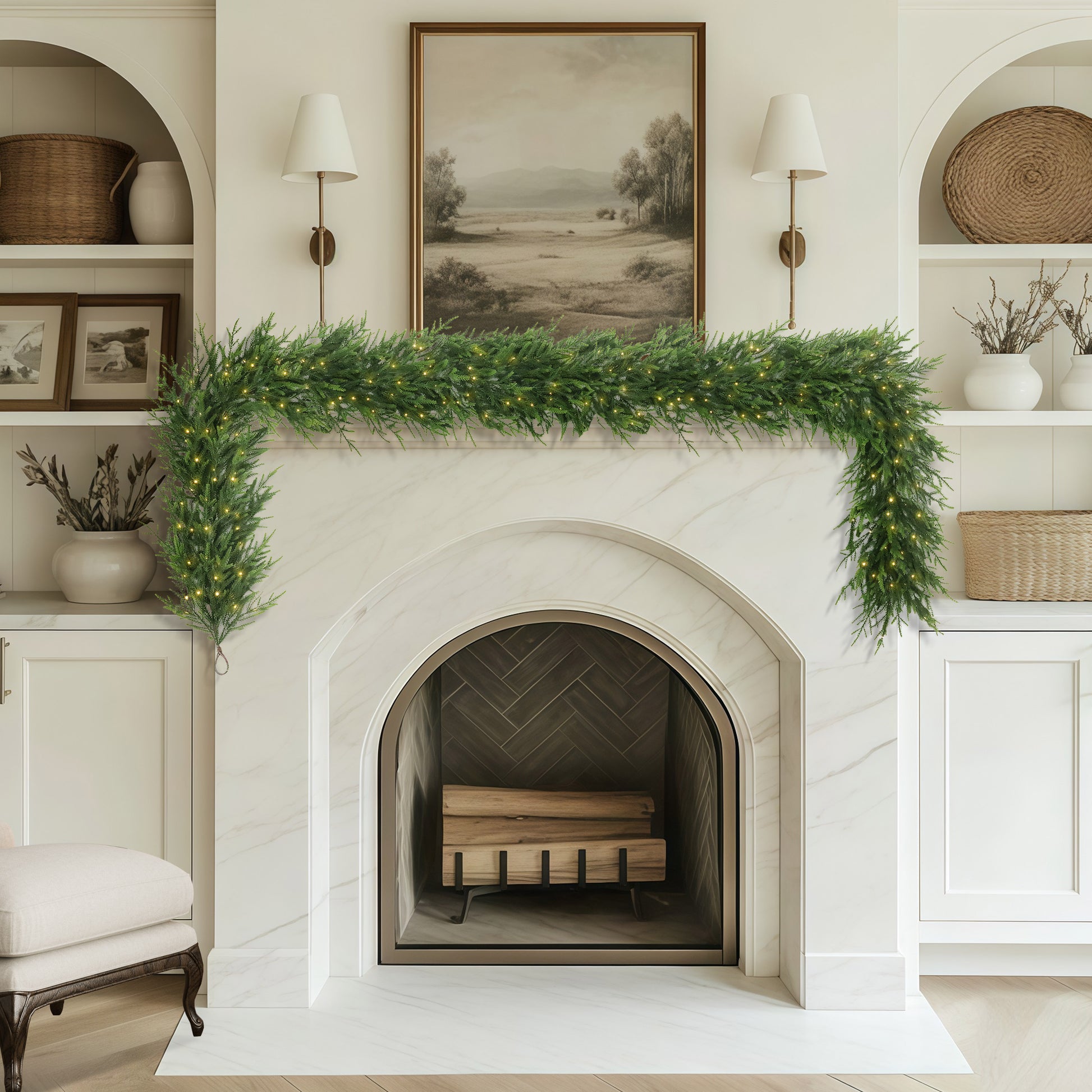 Illuminate your entire entryway with the brilliant Prelit Deluxe 10ft Pine Garland. This staple piece features 184 full Pine tips and is stunningly lit with 200 Battery-Operated with integrated timer Warm White LEDs, creating a spectacular, powerful glow. The cordless design and generous length ensure you can seamlessly drape this thick, luminous pine greenery anywhere you desire, transforming your space into a festive haven with zero effort.